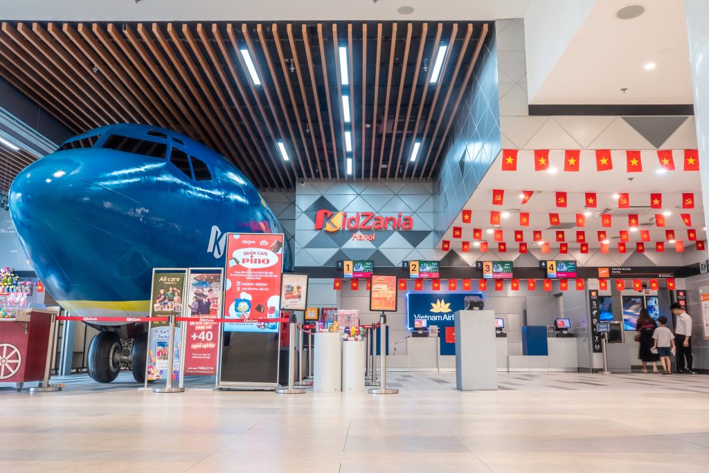 From the moment visitors step into KidZania Hanoi, they are immediately impressed by the image of a real Boeing aircraft at the entrance, featuring the distinctive branding of Vietnam National Airlines.