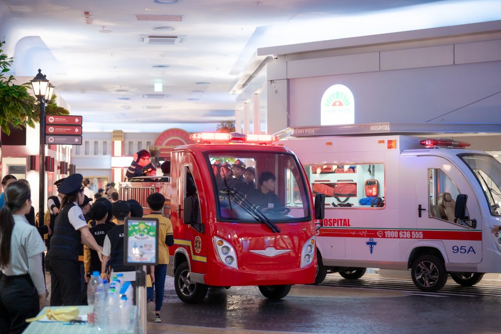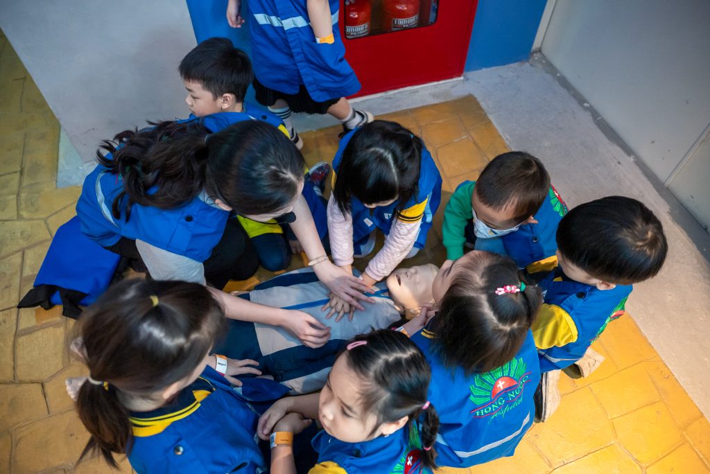 Becoming an emergency medical technician, children will be guided in checking pulses and performing chest compressions – crucial skills that increase the chances of survival in the 4 minutes of the “golden hour.” After successful first aid, the next task is to carefully place the patient on a stretcher and safely transport them to the ambulance for timely delivery to the hospital. Through this experience, children not only learn basic first aid skills but also learn how to calmly handle situations, enhance their sense of responsibility, and better understand the specifics of the emergency medical profession.