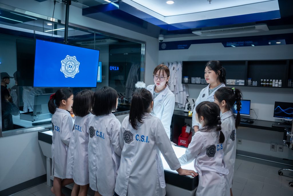 In a 25-minute challenge, the “junior investigators” need to be very careful when working with a series of important evidence and documents. Using specialized tools such as special lights for examining fingerprints, film for collecting traces, tweezers for picking up evidence… to follow every small detail, connect clues and solve the case logically and accurately. One of the fun role-playing games that helps train observation, analysis and meticulousness in young children.